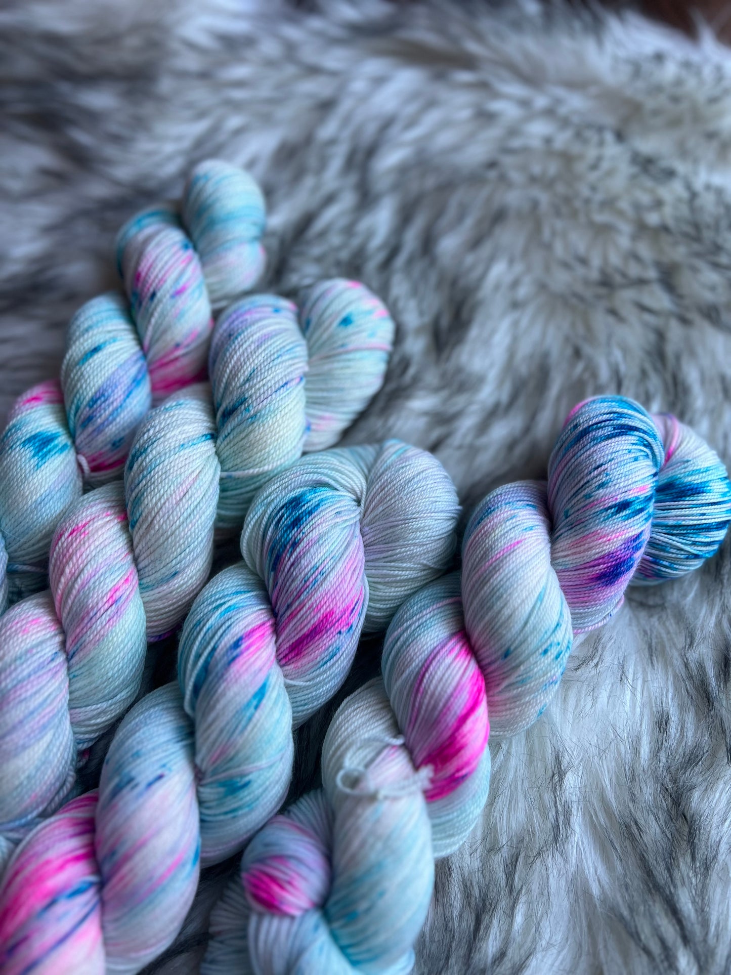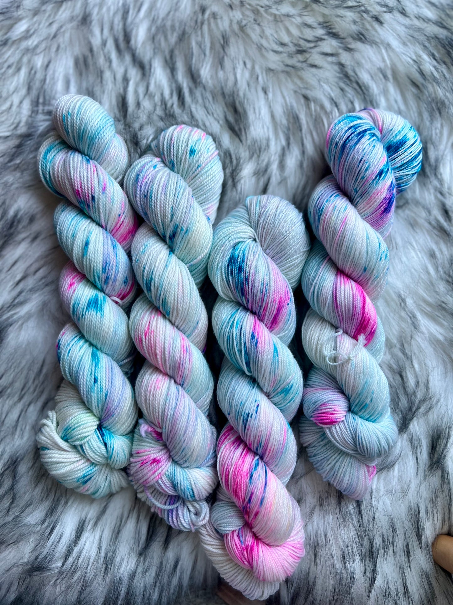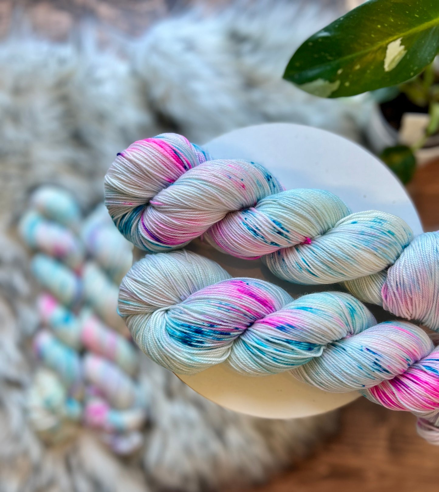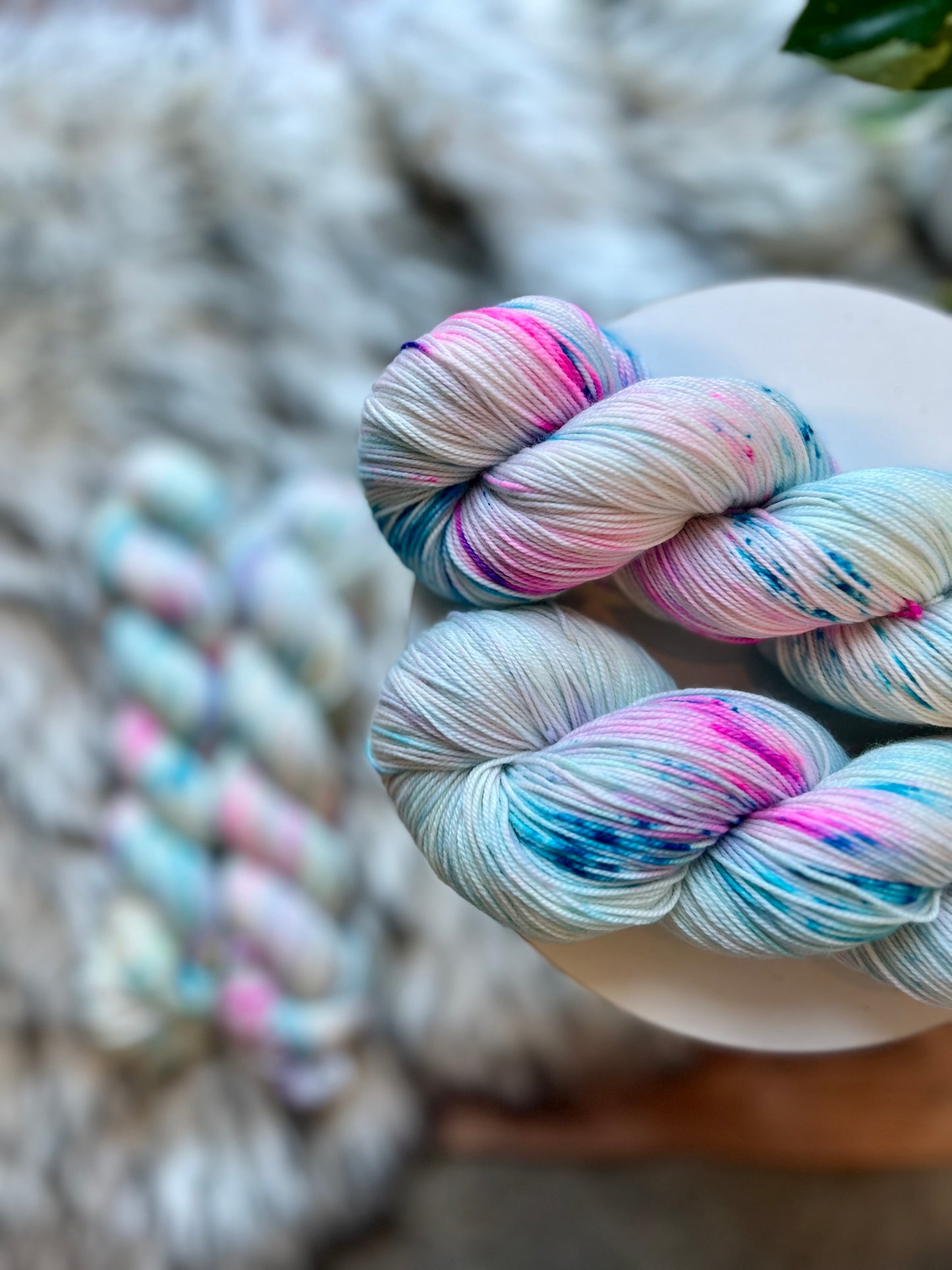 Step into a galaxy of colour with Stellar Bloom — a hand-dyed merino yarn bursting with vivid pinks, blues and purples inspired by cosmic blooms and starlit skies.