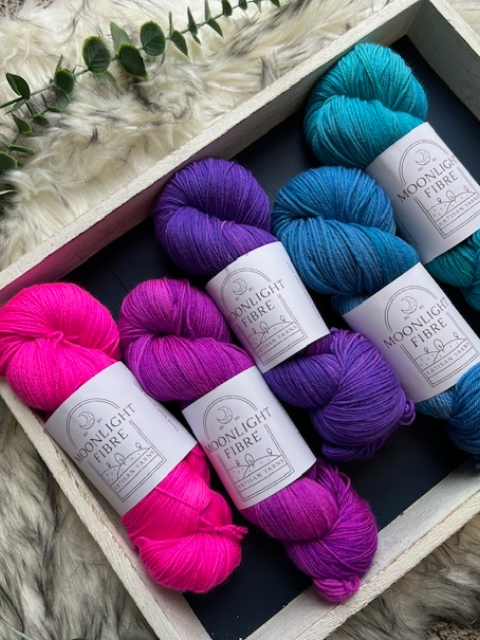 Bring the cosmos to your needles and hooks with this full set of Moonlight Fibreās signature celestial colourways. Youāll receive five beautifully hand-dyed skeins, one in each colourway, all made to order just for you.