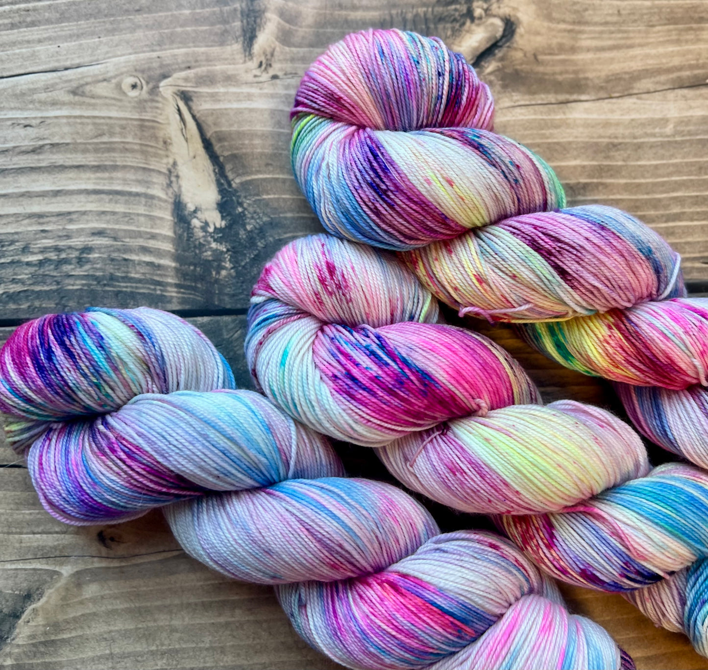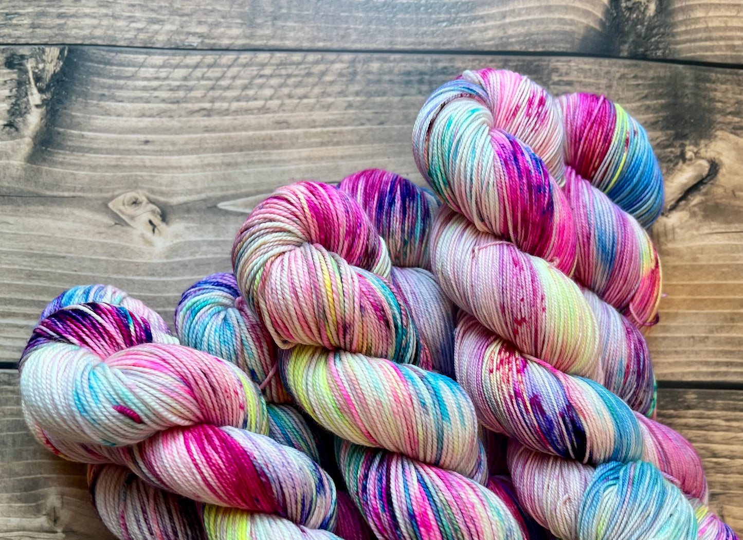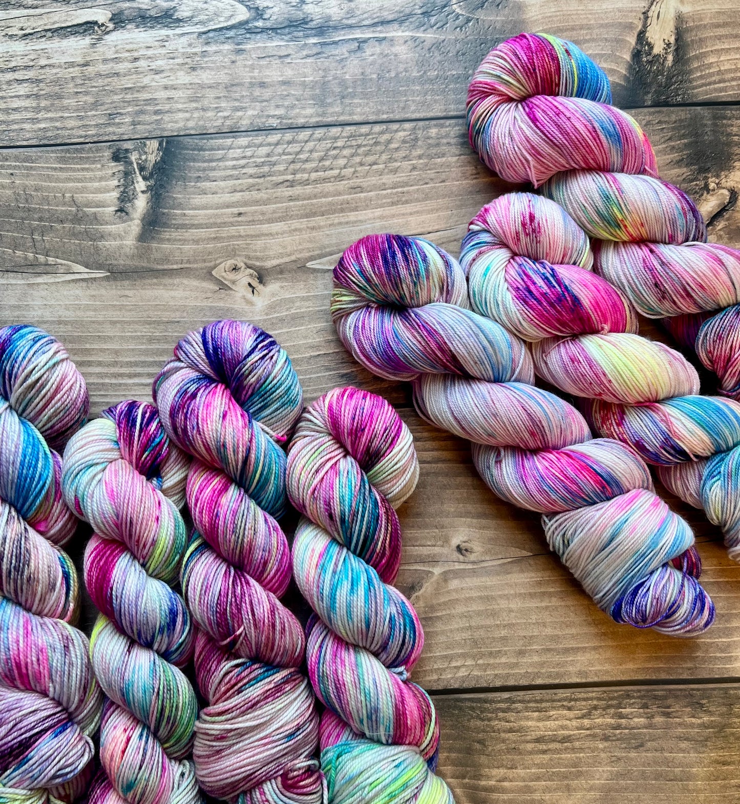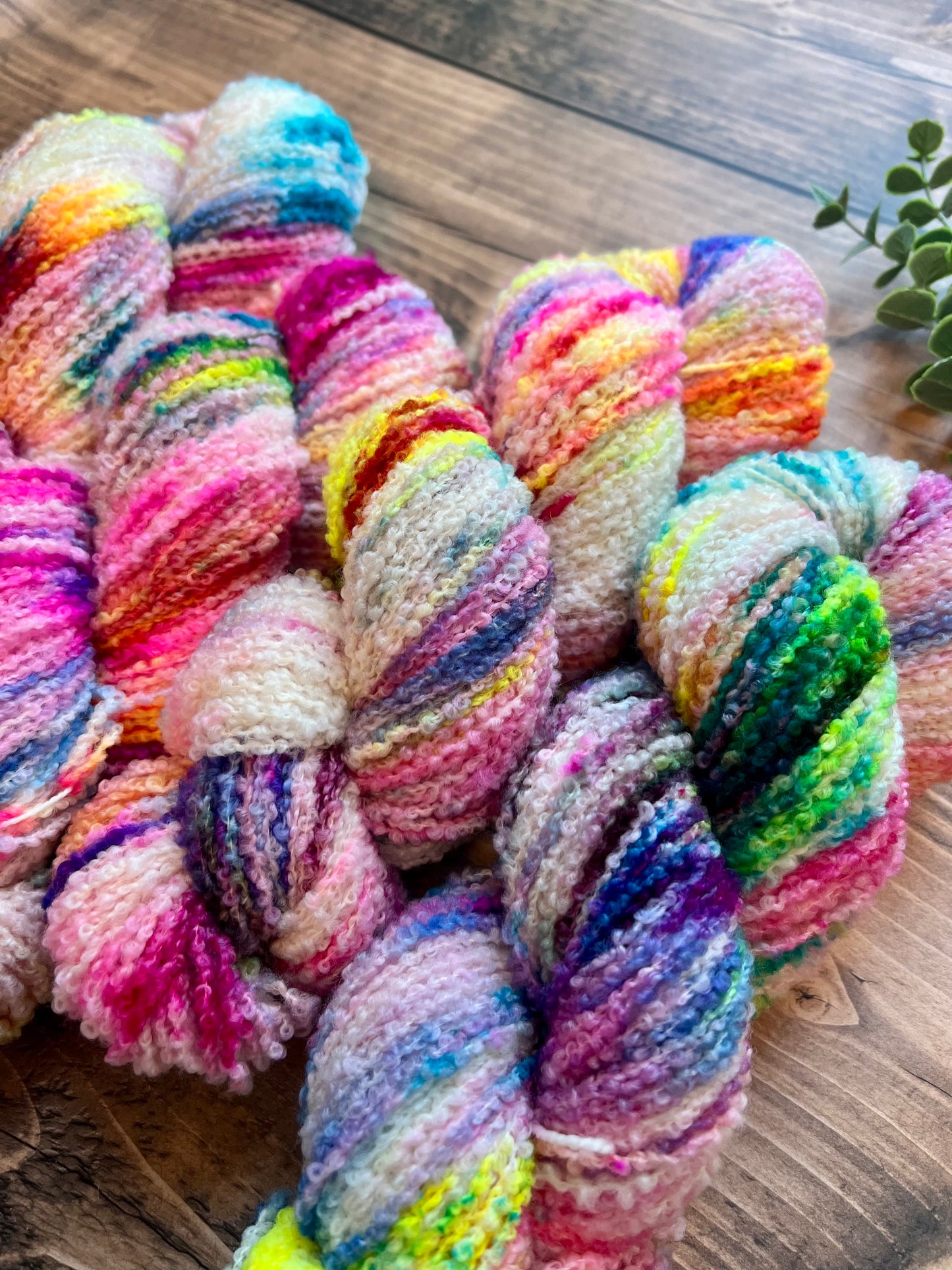 Add a splash of color to your next project with Prismatic Pop! This bright and playful yarn features neon yellow, green, blue, and pops of purple. Let your imagination run wild with this fun and vibrant yarn.