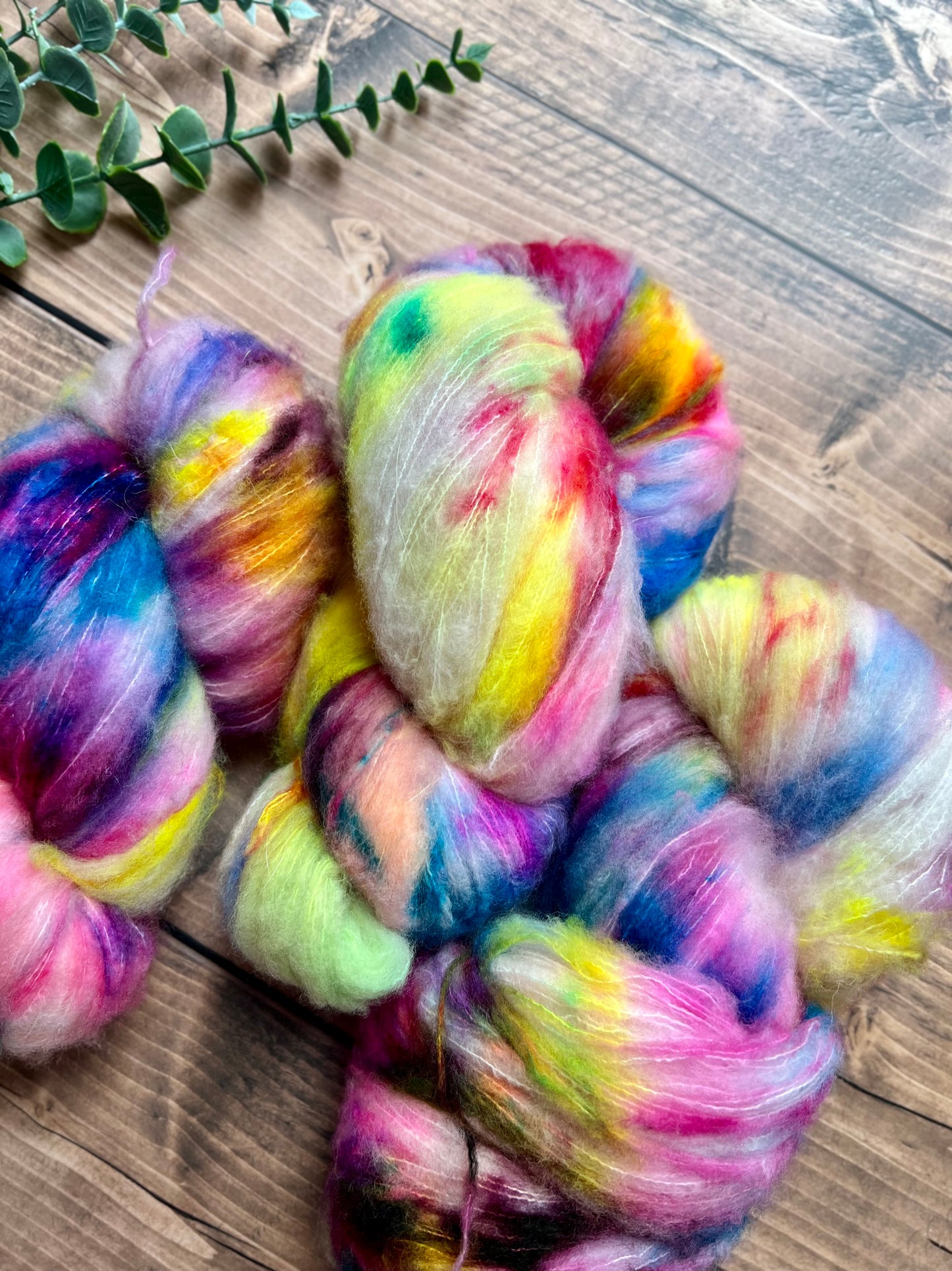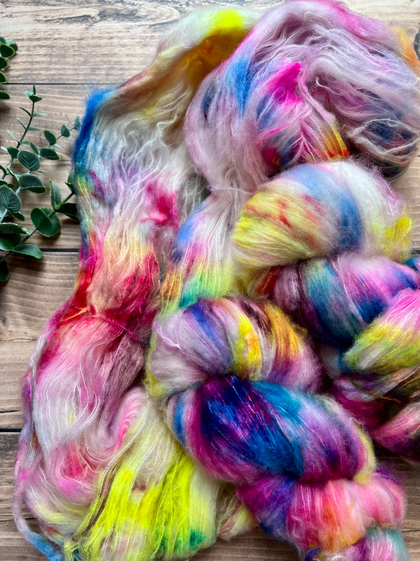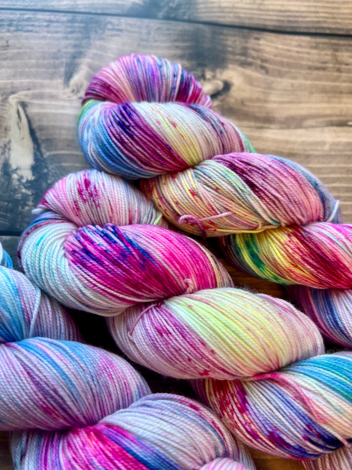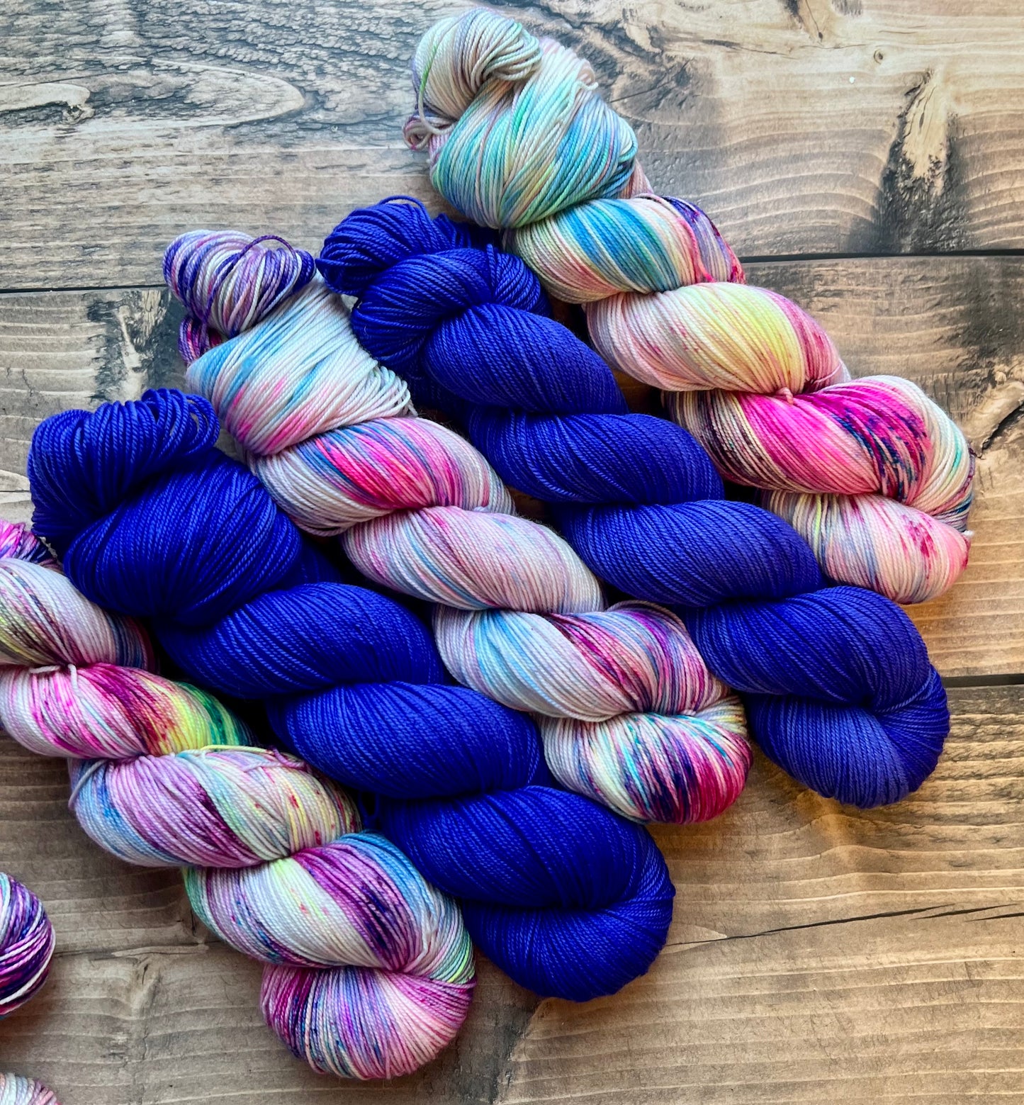 Add a splash of color to your next project with Prismatic Pop! This bright and playful yarn features neon yellow, green, blue, and pops of purple. Let your imagination run wild with this fun and vibrant yarn.
