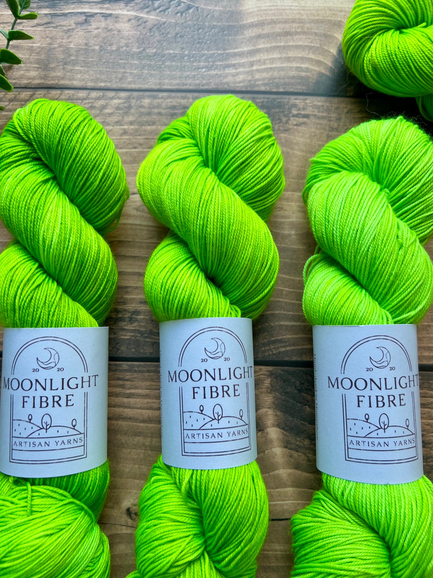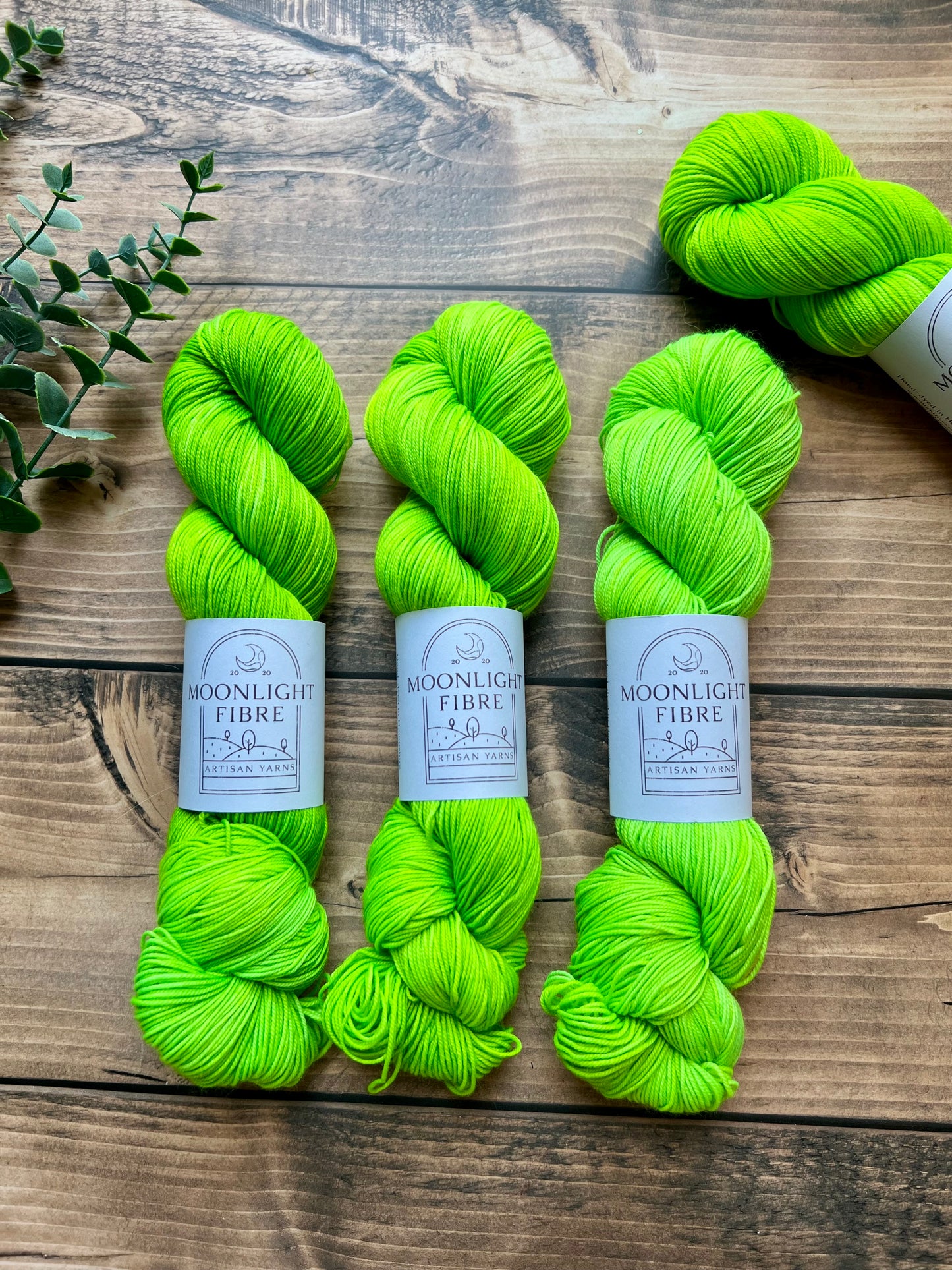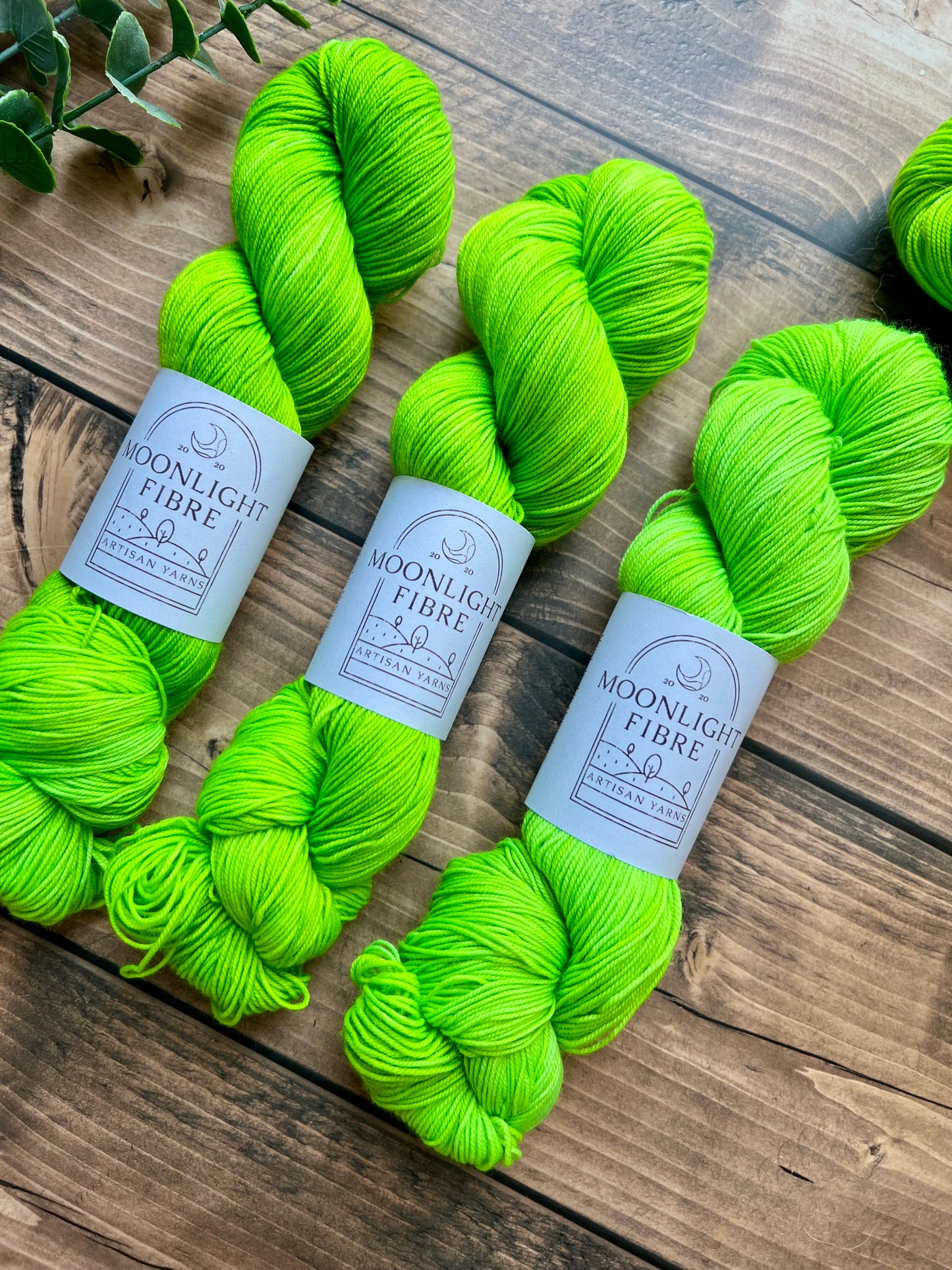 Introducing Toxic Bloom, a vibrant semi-solid lime green. Infuse your yarn crafts with a bold pop of color. Poisonously playful and perfect for adding a touch of fun to any project.