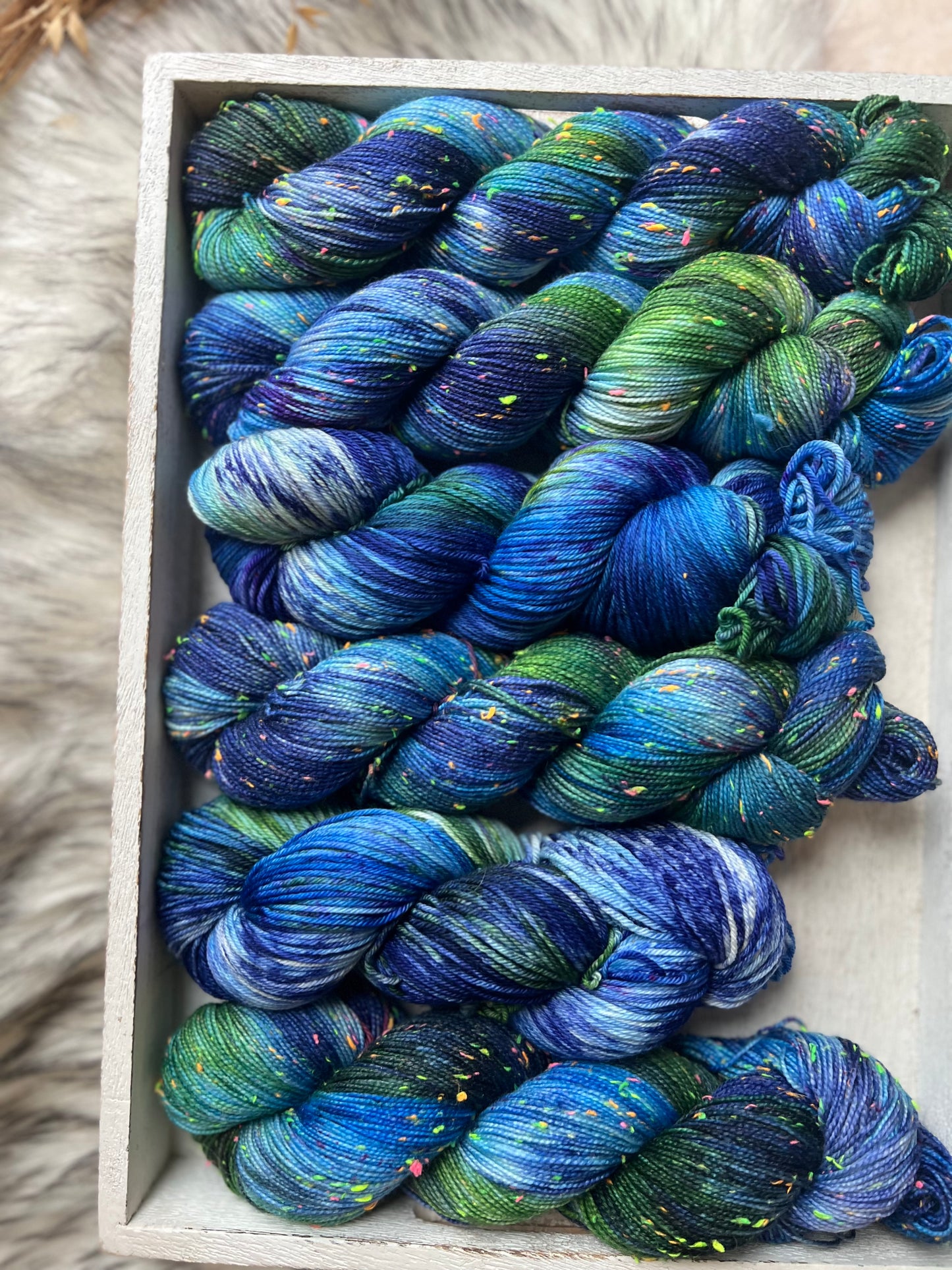 Dive into the depths with Sea Spirits, where cool aqua, teal, and seafoam green blend with hints of stormy grey. This ethereal colourway captures the ever-changing moods of the ocean, from tranquil shallows to mysterious depths.